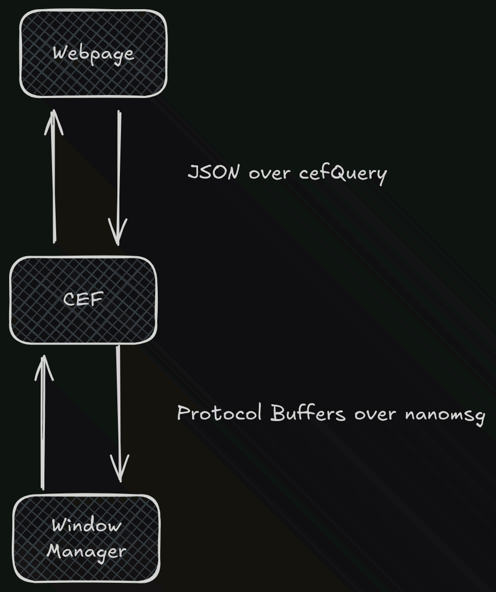 So how do we actually pull off this magic trick? I started with the web browser because I figured this would be the hardest bit. We need to communicate with the Javascript process while keeping access to low level interfaces as to interact with our windows. Then the other requirement is being able to serve our webpage without a HTTPS request leaving our computer.